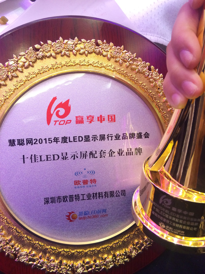 贏享中國.強力巨彩杯2015年LED顯示屏行業(yè)高峰論壇暨頒獎盛典12月15日在深圳西麗麒麟山莊順利召開。恭喜得獎的各位行業(yè)大伽及企業(yè),同時也恭喜深圳歐普特工業(yè)材料有限公司獲得十佳LED顯示屏配套企業(yè)品牌