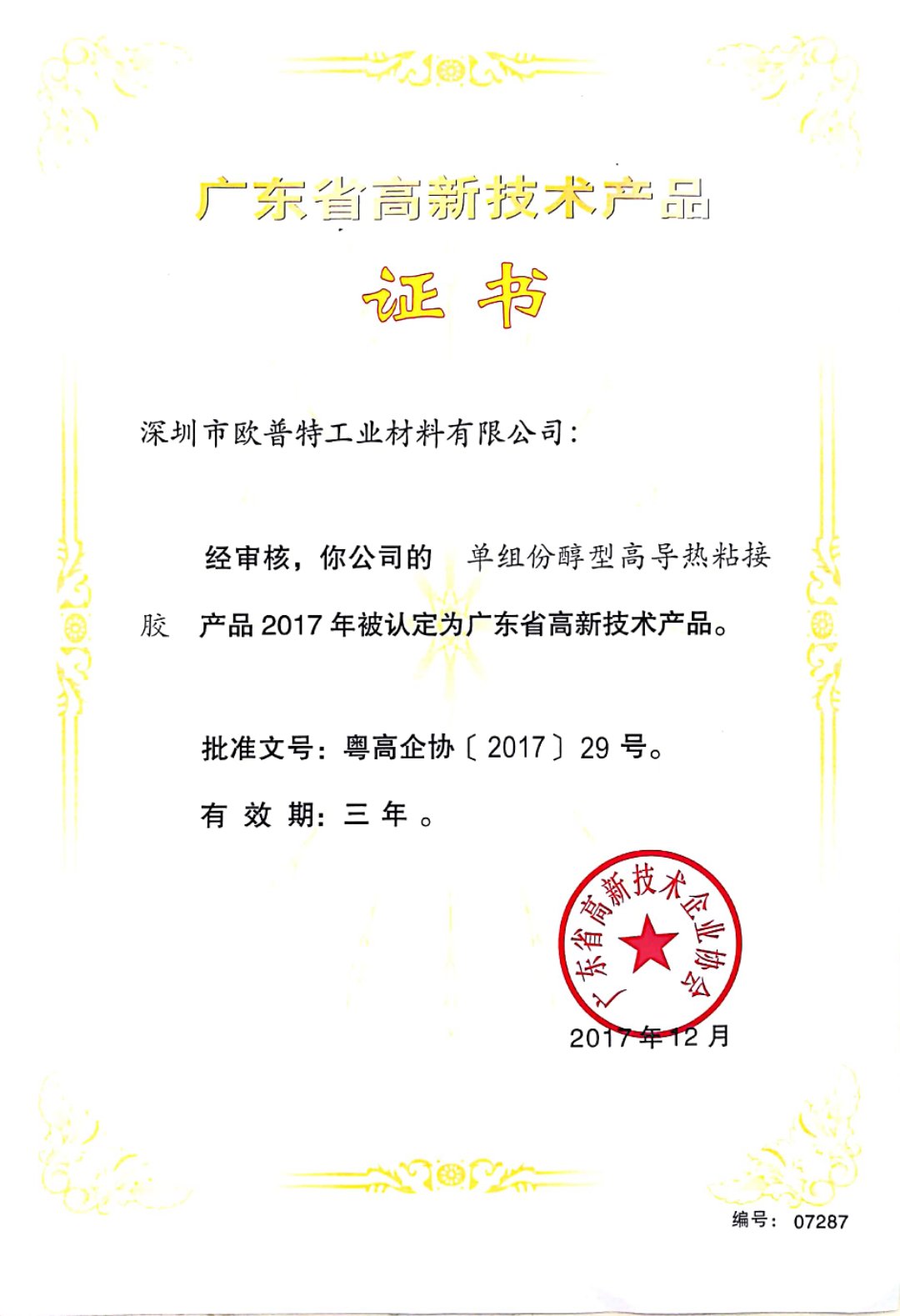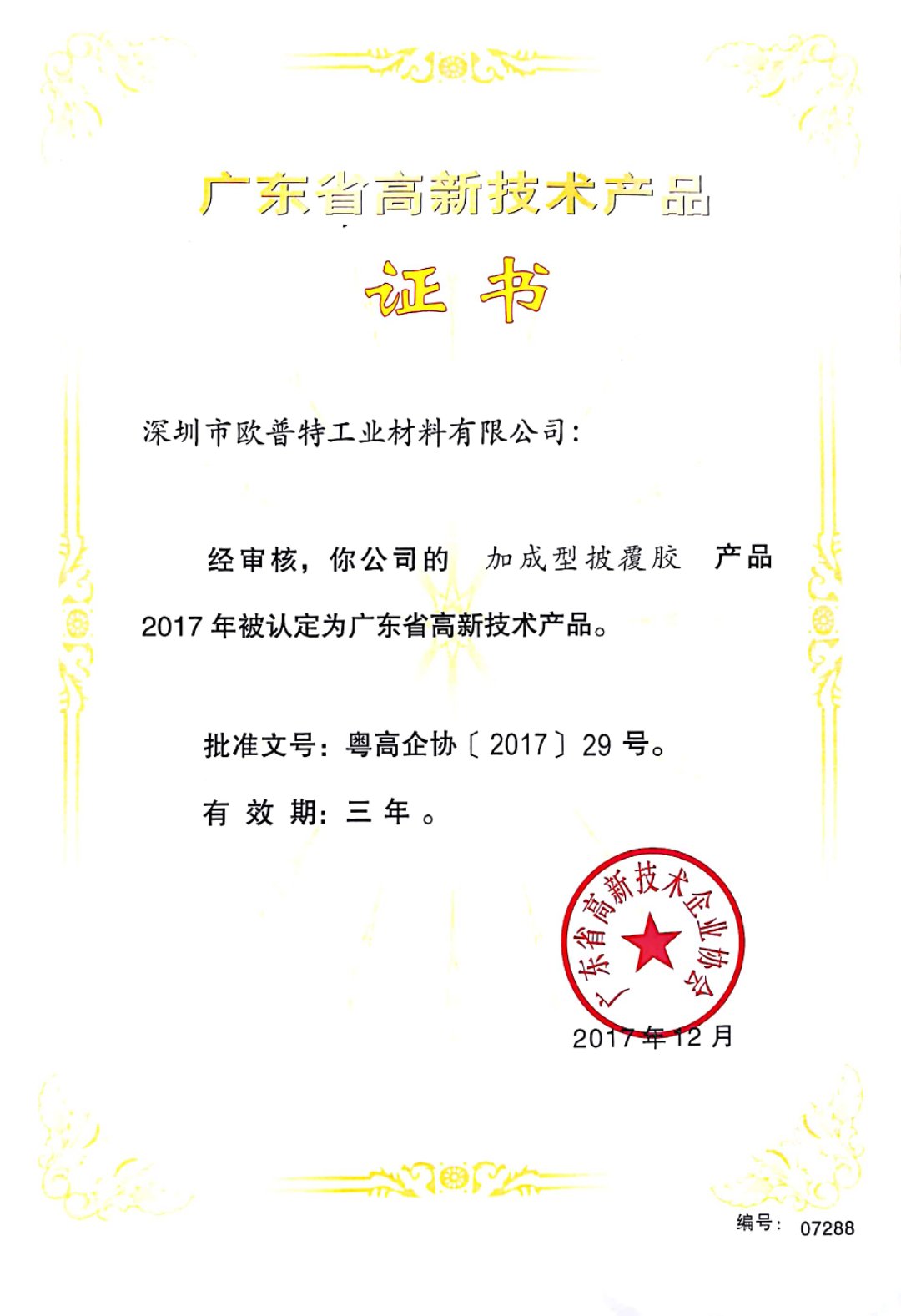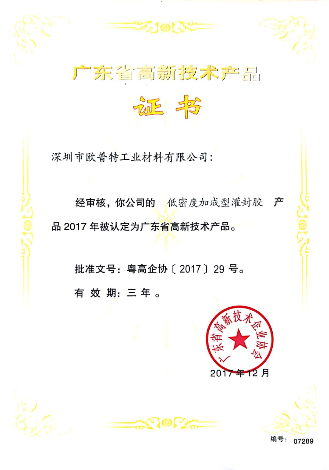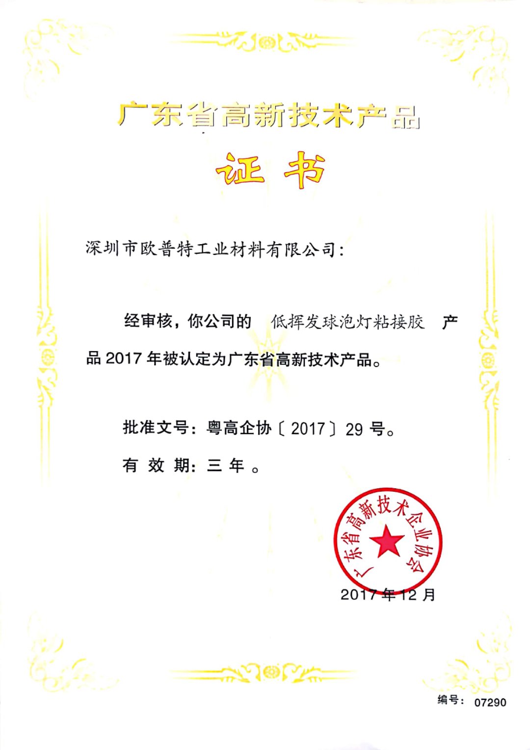 深圳市歐普特工業(yè)材料有限公司于2017年10月申請(qǐng)的6項(xiàng)廣東省高新技術(shù)產(chǎn)品經(jīng)過專家評(píng)審,于2017年12月通過廣東省高新技術(shù)企業(yè)協(xié)會(huì)認(rèn)定,并于2018年5月領(lǐng)取了證書。